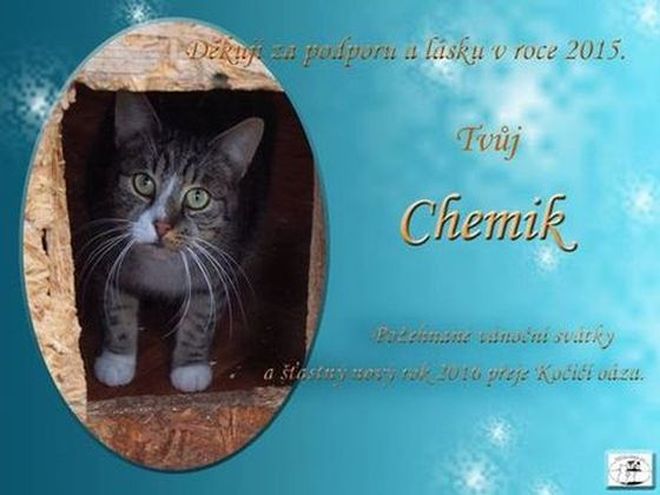 Celý rok podporujeme kocourka Chemika v Kočičí oáze v Holubicích. K vánocům jsme mu poslali ještě navíc konzervičky, které má rád a dostali jsme od něj krásné přáníčko. Moc za něj děkujeme.